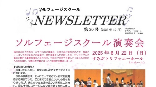 毎年 3 月・10 月の年 2 回発行していた「ソルフェージスクール新聞」ですが、イベントのご報告や今後の予定などの最新情報を、よりリアルタイムにお知らせできるよう、発行回数を増やすことにしました。 「ソルフェージスクール NEWSLETTER」と名前もリニューアルし、コンパクトで充実した紙面にしていきますので、引き続きよろしくお願いいたします。