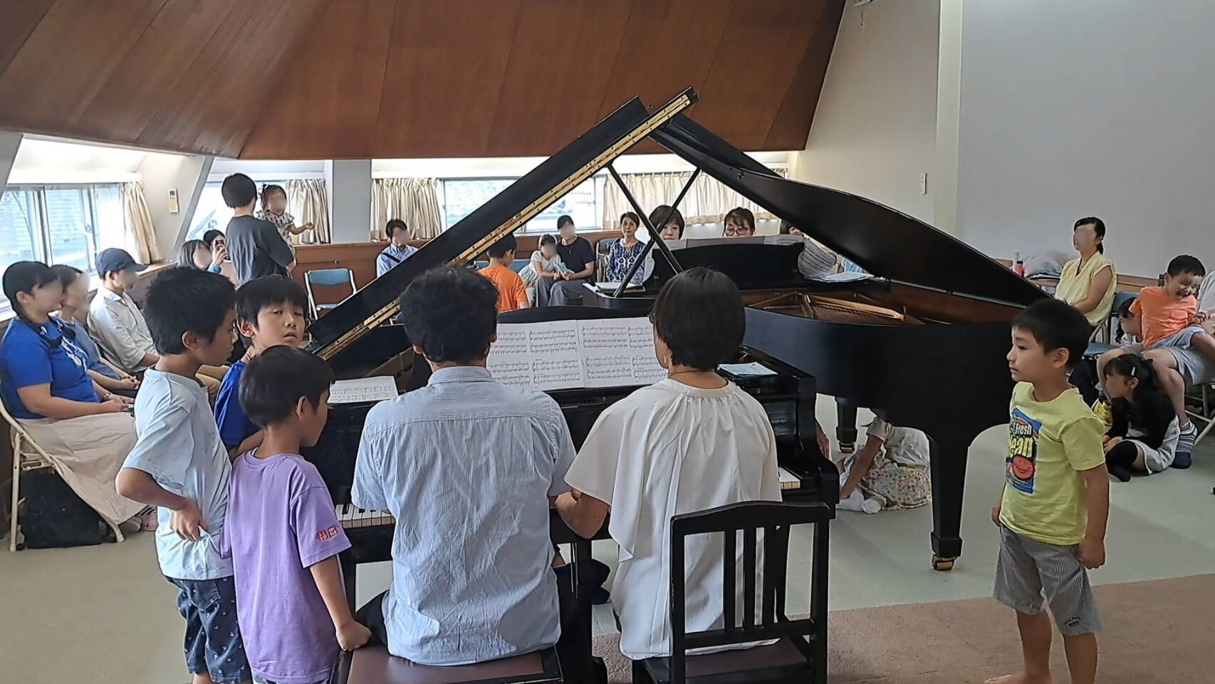 第5回目のちびっこコンサート(通称:ちびコン)は夏の猛暑(今年も長かった…)がやっと影を潜め、秋気とはいかないまでも気持ちの良い秋晴れの中行われました。 開場時刻が過ぎても受付はし~んと静まり返ったまま。 ちょっと寂しい…と思っていたのも束の間、すぐにちびっこたちの活気に満ち溢れた声にスクールは包まれました!ちびっこの熱気に後押しされる形で、ちびコンのテーマソング『いっしょに、ね』(詞:桑原永江)が江原先生によって活き活きと歌われました。前半は歌とピアノによるプログラムです。 さぁ、演奏が始まりました。ピアノの鍵盤の横にはちびっこの顔がひょこり、足元にもちびっこがそろり、目の前にはピアノ内部をのぞき込む抱かれたちびっこ。上下左右、後ろま でもちびっこ、まさに四面楚歌(しかし、敵ではない!)状態の中、『エリーゼのために』を弾く経験はそうできるものではありません。 ミレ#ミレ#ミレ#…、を何回弾いたか…と焦りつつ、皆様に超有名曲をお届けできる喜びを感じながらの演奏でした。 ピアノ演奏の後は、我らが江原先生による子どもの歌。 秋の歌をはじめ、誰もが知っている童謡を歌っていただきました。 振り付けをしながら、抱っこしながらの美しい歌唱は、これぞ名人芸と言わざるを得ません。 ちびっこだけでなく元ちびっこの大人までもが、その歌声に惹きこまれていました。